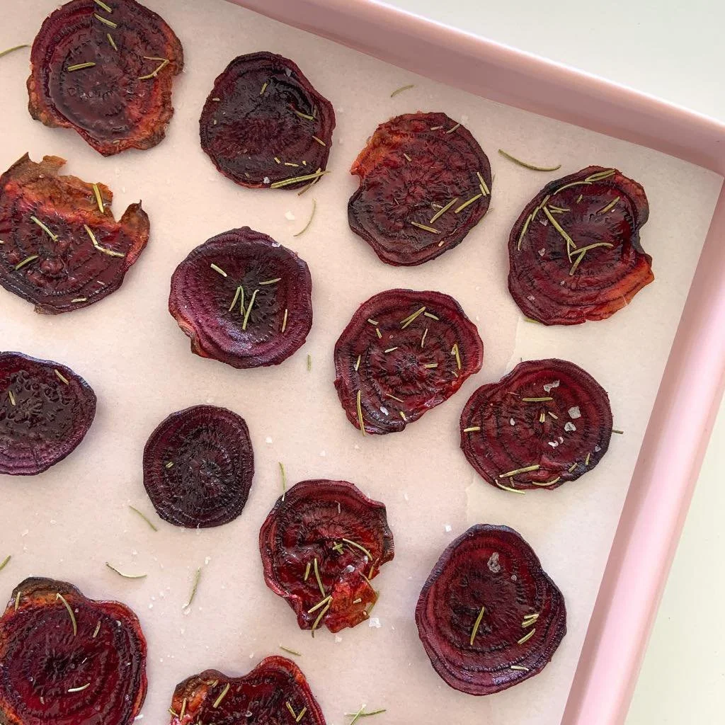 Bake for 45 minutes until crisp. Flip the beetroot slices halfway.